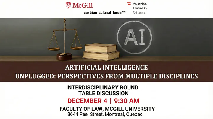 Die Veranstaltung „Artificial Intelligence Unplugged: Perspectives from Multiple Disciplines“ widmet sich als interdisziplinäre Podiumsdiskussion der kritischen Auseinandersetzung mit aktuellen und emergenten Anwendungen künstlicher Intelligenz (KI). Organisiert vom Institute of Air & Space Law der McGill University in Kooperation mit der Österreichischen Botschaft Ottawa und dem Österreichischen Kulturforum, adressiert das Format die Diskrepanz zwischen der rapiden technologischen Integration von KI und den oft isoliert stattfindenden Diskursen in Technik, Ethik, Recht und Gesellschaft. Ziel ist es, diese disziplinären Silos zu überbrücken und eine ganzheitliche Analyse der Vorteile, Limitationen und Risiken von KI-Systemen zu ermöglichen. Das Panel vereint Expertise aus Medizin, Recht, Ingenieurwesen und Industrie, um divergierende Perspektiven – von der genetischen Forschung über ethische Fragen der Neurotechnologie bis hin zu KI-Strategien in der Luftfahrt und partizipativen Ansätzen – zu synthetisieren. Zudem werden zukünftige Entwicklungspfade sowie regulatorische Herausforderungen diskutiert.