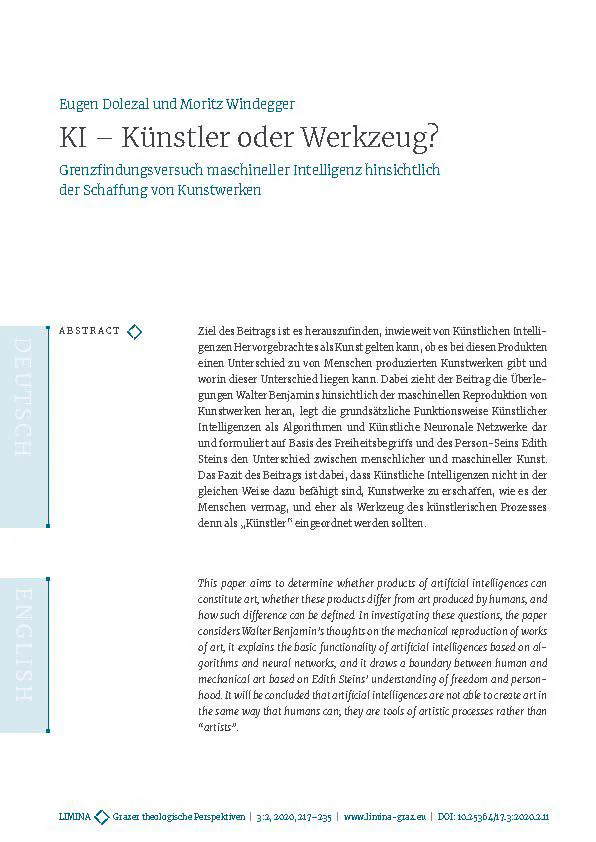 Ziel des Beitrags ist es herauszufinden, inwieweit von Künstlichen Intelligenzen Hervorgebrachtes als Kunst gelten kann, ob es bei diesen Produkten einen Unterschied zu von Menschen produzierten Kunstwerken gibt und worin dieser Unterschied liegen kann. Dabei zieht der Beitrag die Überlegungen Walter Benjamins hinsichtlich der maschinellen Reproduktion von Kunstwerken heran, legt die grundsätzliche Funktionsweise Künstlicher Intelligenzen als Algorithmen und Künstliche Neuronale Netzwerke dar und formuliert auf Basis des Freiheitsbegriffs und des Person-Seins Edith Steins den Unterschied zwischen menschlicher und maschineller Kunst. Das Fazit des Beitrags ist dabei, dass Künstliche Intelligenzen nicht in der gleichen Weise dazu befähigt sind, Kunstwerke zu erschaffen, wie es der Menschen vermag, und eher als Werkzeug des künstlerischen Prozesses denn als “Künstler” eingeordnet werden sollten.
